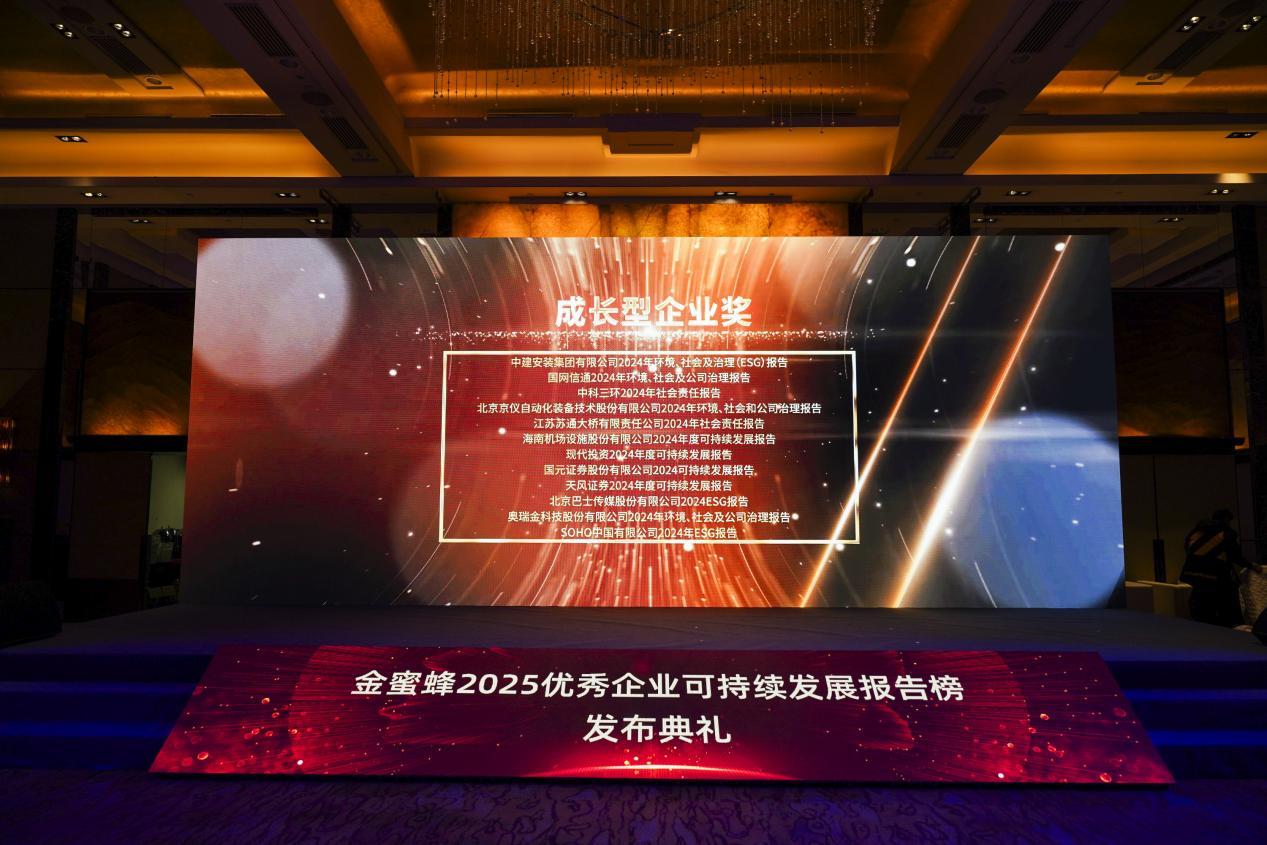 2025年12月5日,由金蜜蜂智库主办的“第十八届中国可持续发展信息披露国际研讨会”在京召开,同步揭晓 “金蜜蜂 2025 优秀企业可持续发展报告榜”,公司凭借《2024 年度可持续发展报告》成功获得 “成长型企业奖”,这一荣誉标志着公司在 ESG 治理水平、可持续发展及社会责任实践等方面的努力获得行业权威认可。